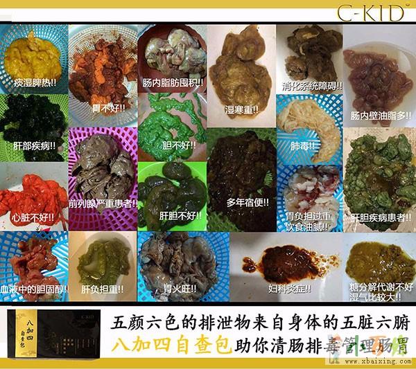 好多朋友通过使用八加四自查包后,每天排便观察了一下,与我们平时排便不一样,小编在这里声明一下,你们别以为排出来的是便便,其实并不是这样,排出来的是体内的毒素和垃圾!虽然它们长得像便便,但是是没有味道的!我告诉你们这些毒素是什么,是你的肝管胆囊肝脏内的各种寄生虫,油脂,结石,服用的药物毒素这些最终都通过胆总管排到十二指肠x~b~a~i~x~i~n~g~c~o~m。然后夹在每一道肠褶皱内排不出去。那么垃圾都是什么,你的肠油(脂肪),没有被消化掉的食物尤其是鸡鸭鱼猪牛羊的腐肉,宿便等小_百_姓_网。所以你知道这些都是什么了吧?真的不是一些人认为的大便。