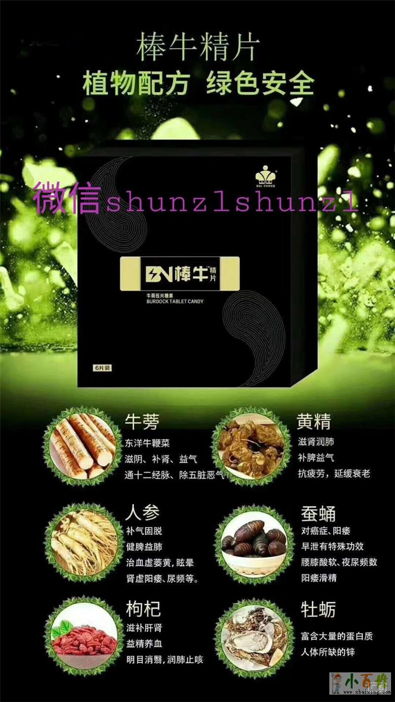 棒牛精片代理商,乐乐微信号18134049630棒牛精片主要成分;牛蒡,人参,牡蛎,蚕蛹,枸杞,大枣等天然草本植物提炼而成。棒牛精片貝有以下六大功效。1强肾固精,补肾生精从而提升勃起频率。2减低睾丸数...